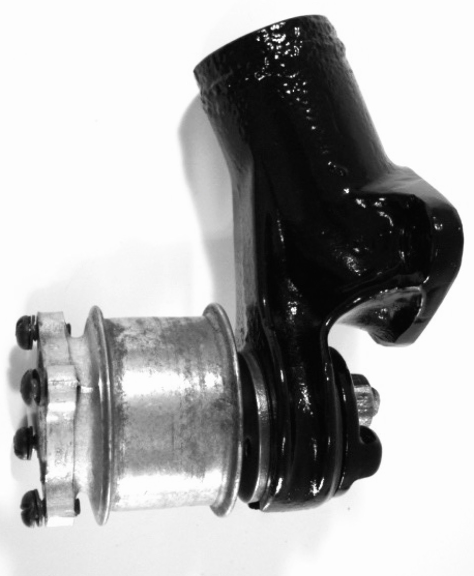The Improved later design uses smooth eccentric drum, that is rotated with an exterior lug on the rear of the drum, and the drum is now held fast withe the fan axle bolt that has flats on the end to hold placement as lock nut is tightened. Parts of each style bracket don’t interchange.