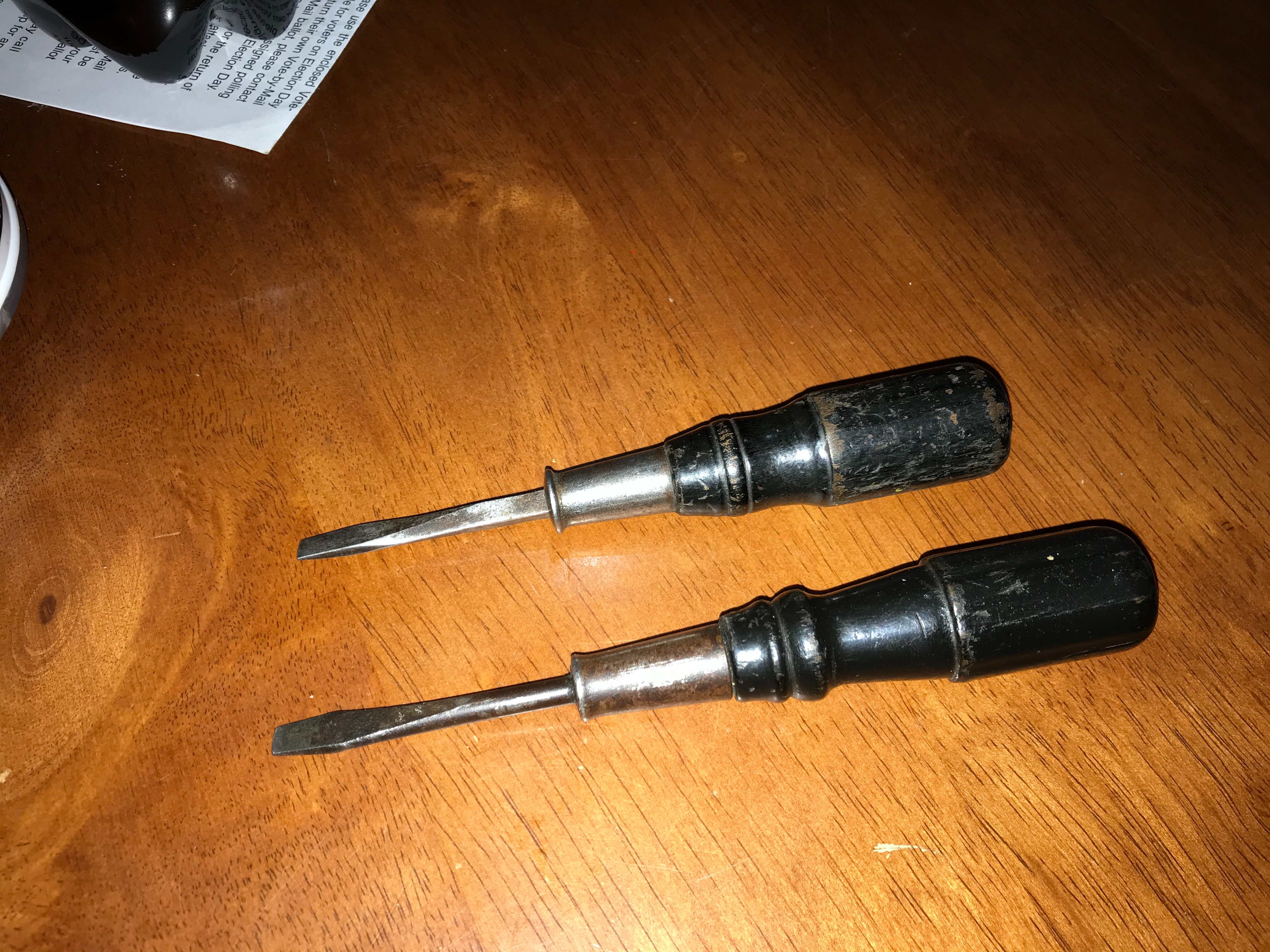 I still use modern plastic handled drivers with steel clear through the handle. These are good to hammer on when trying to unscrew wood screws which have rusted in place.