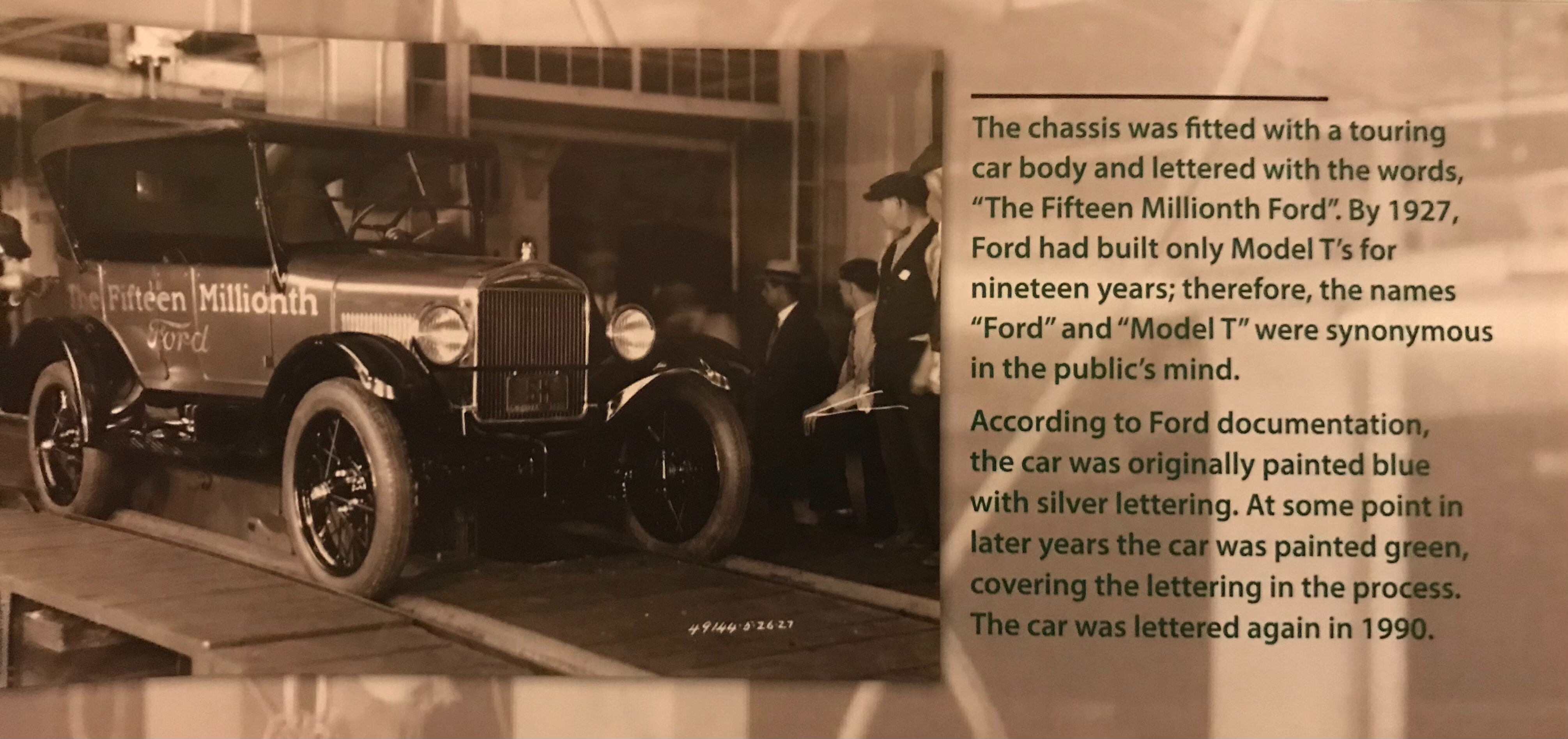 Caution regarding the 15,000,000 model T touring. It came off the assembly line painted blue with silver lettering. It was overpainted in green during the 1950's, the current white lettering was applied recently.