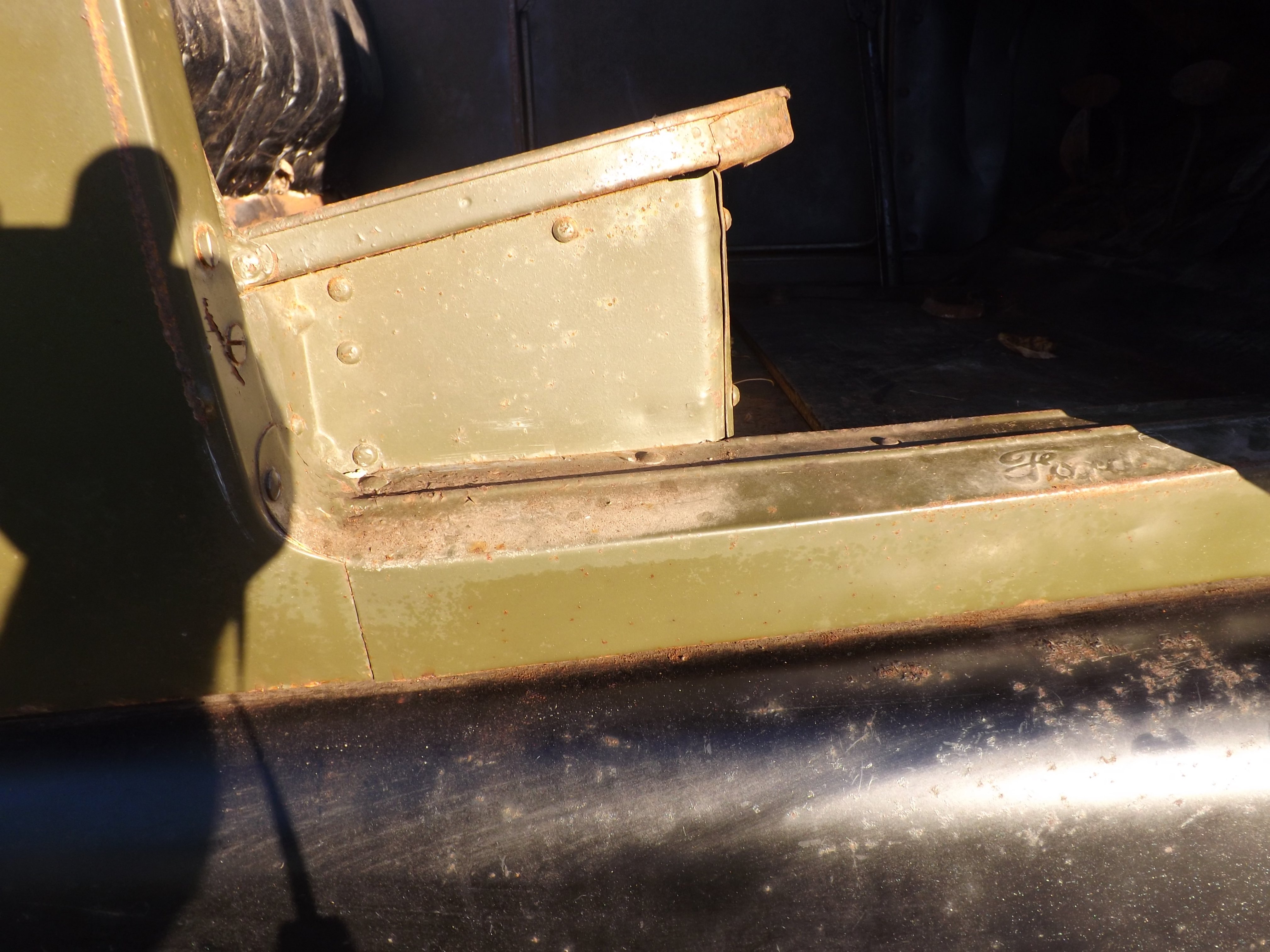 Susanne, Jim, I believe it looks more like "Ma Bell" AT&T green and not as dark as a VietNam era Olive Drab, I seem to think earlier military colors may have been lighter going by what I have seen on vehicles in such places as the U.S. Army Transportation Museum in Fort Lee, Virginia. Anywhere I look on this car all I see is the same color, where the paint has peeled due to poor storage there is bare unprimed metal w/o any sand paper type scratches. I have known about this car for over 30 years. The owners father then a retired farmer bought it off the original family 35-40 years ago about 25 miles from where he lived here in Central NY. I am more interested in the history of this T, I am only "charged" with putting it in operating condition, I put it in storage today for the winter & will try to get the steering wheel, rear floor boards & replacement fuel tank renovated this winter as well as some items for my own fleet. The engine #14947xxx shows in Bruce's Book as a May 9 1927 & carries the same frame number. George