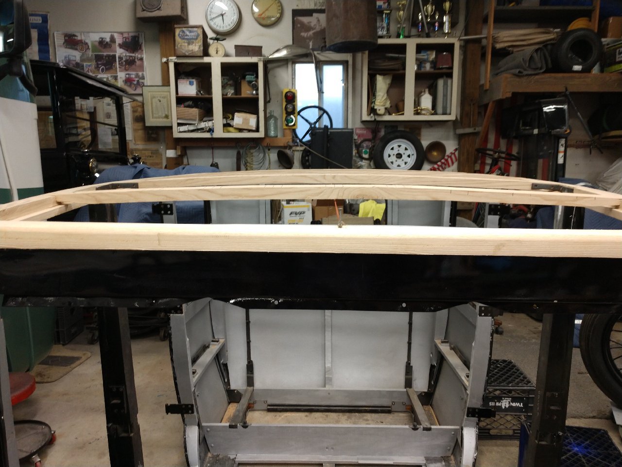 Get'n on top of the top !! I hope Henry forgives me but I'm adding a little muscle to the corner pieces. Every T I've worked on, the corner pieces had failed. So I'm making the entire rear top piece by laminating and crossing the grain so to prevent future problems. It's the hard way to do it but I'm sure it will last much longer. 1927 Model T Fordor ***keep in mind EVERYTHING is in the rough stage yet. ***