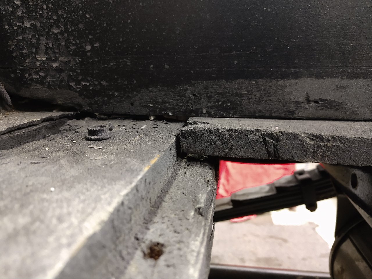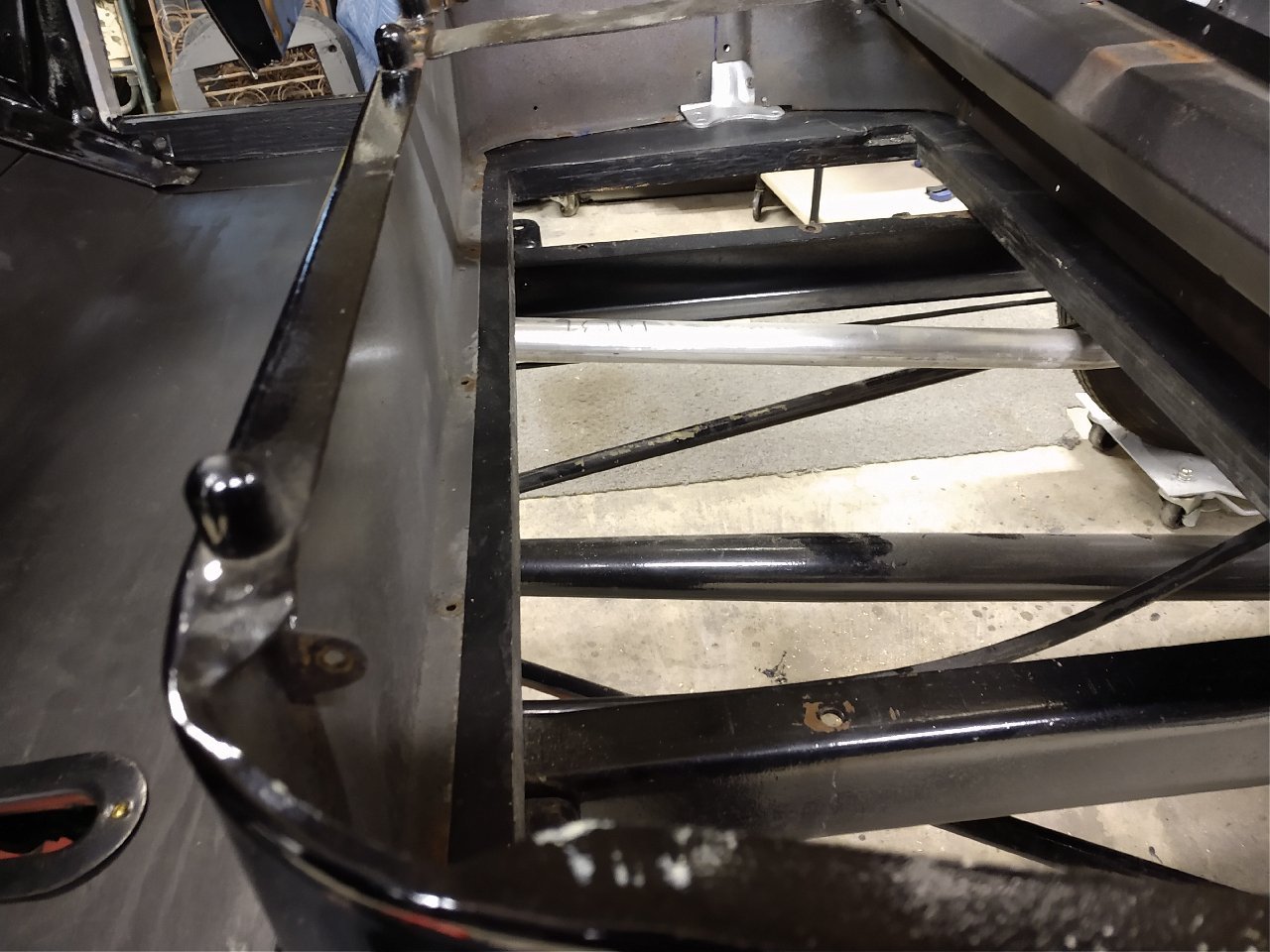 I've mentioned on prior posts about the main-rail crossmember tenon wear. Here is a perfect example of just that. The main-rail outer edge has settled more than a 1/4" on both sides of the car. This may seem minuscule but when the time comes for the final fitting and door operation it can make for a frustrating reward for a heck of alot of work.