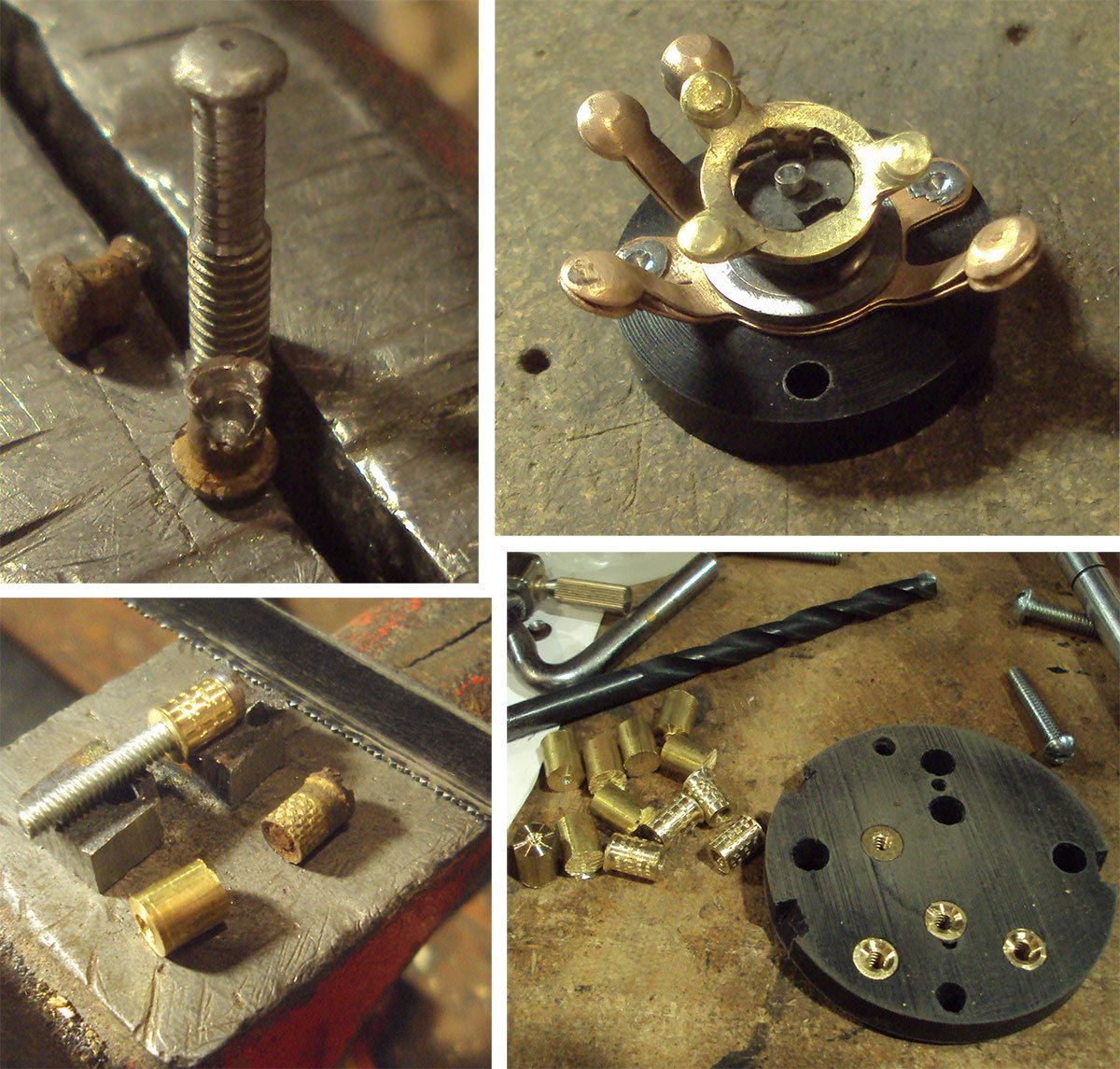 New rivets were made from #8 screws for attaching the contacts to the light ring. A .099 nail worked for riveting the ignition plug washer although a bit tedious drilling a hole into the center of it. I made the back plate from a plastic material found at the Army/Navy store. Not Delrin but perhaps nylon or something. It didn’t machine quite as nice. I turned some brass slugs and threaded them. The originals had a knurled surface to keep them from turning. I hammered a hacksaw blade into them to serve the same purpose. Back together that switch works well