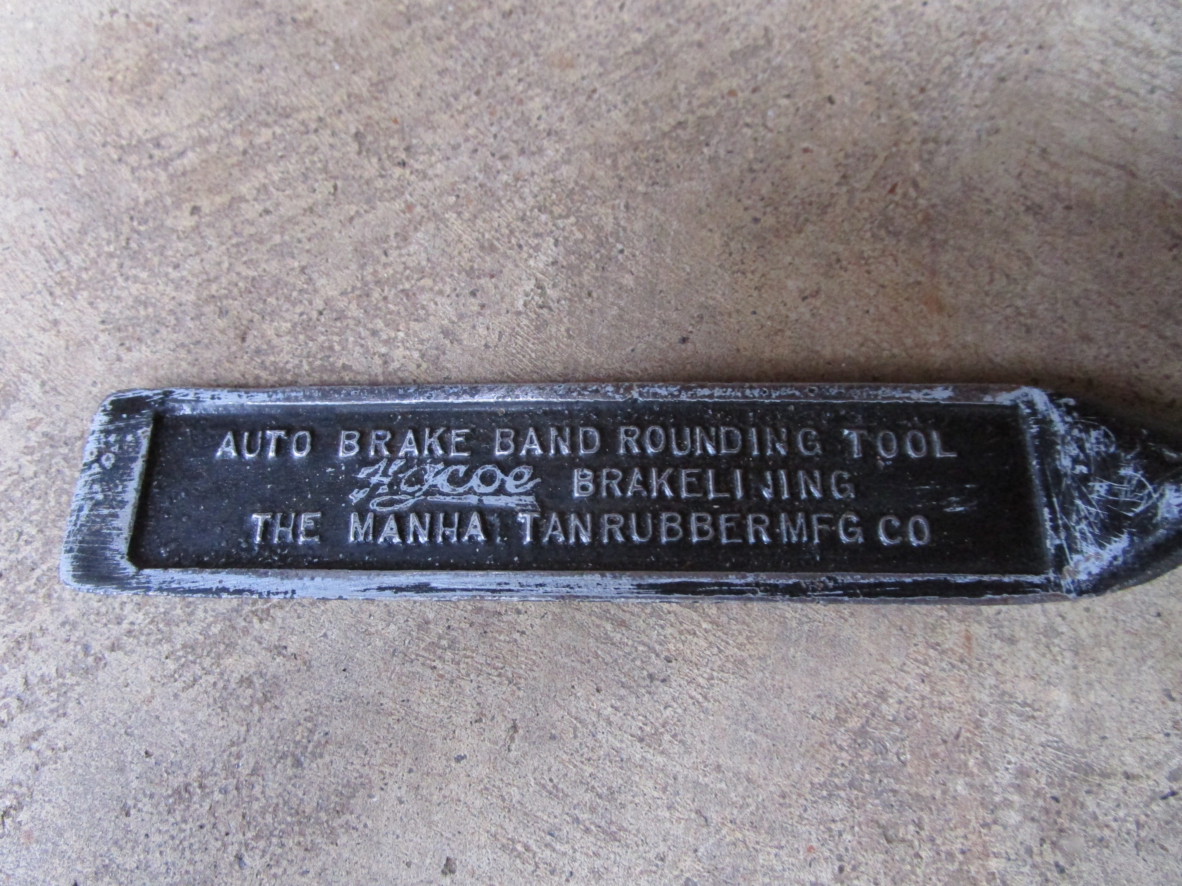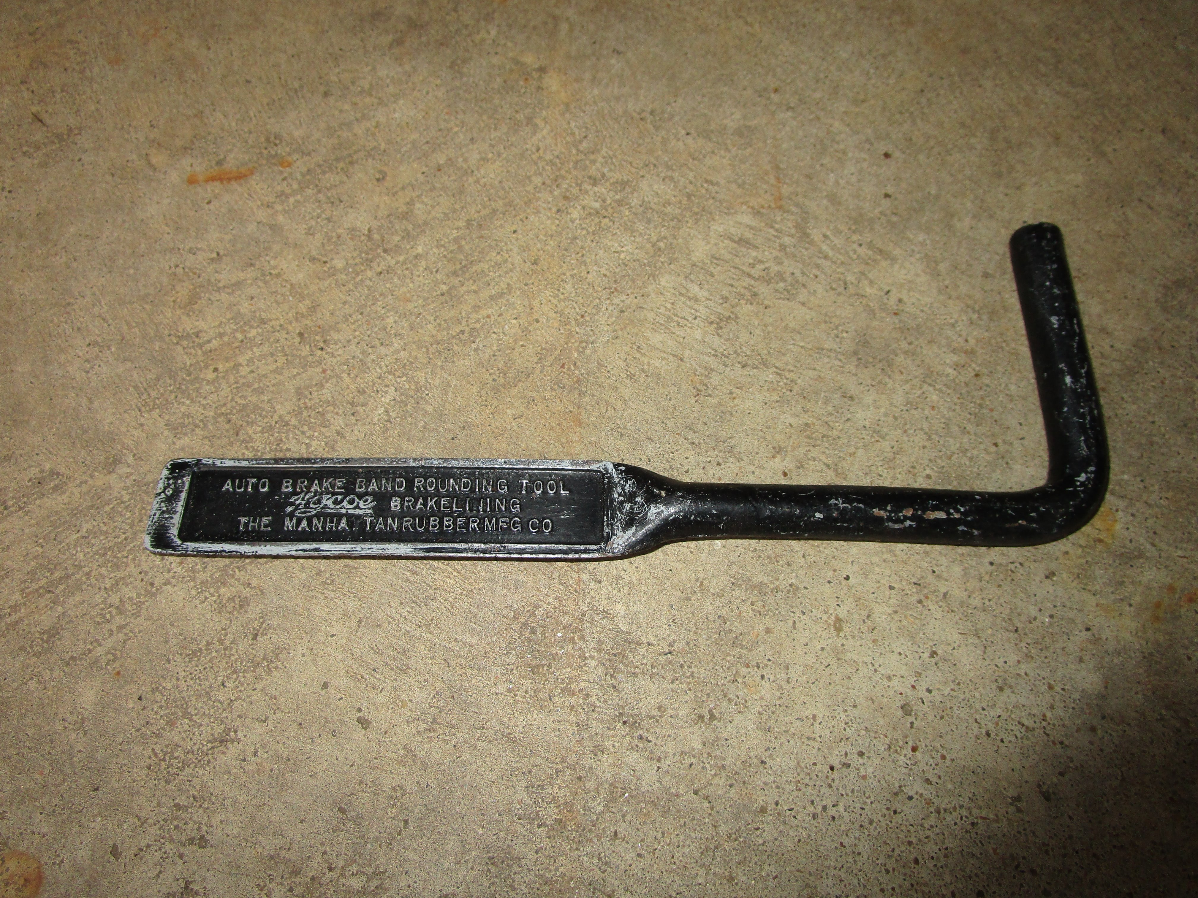 Might it work to take kinks out of external brake bands, especially after re-lining. If the flattened end is inserted between the drum and the lining, lettered side to the drum, and the bent stem worked to rotate the curved side, it would lever any kinks out of the bands.