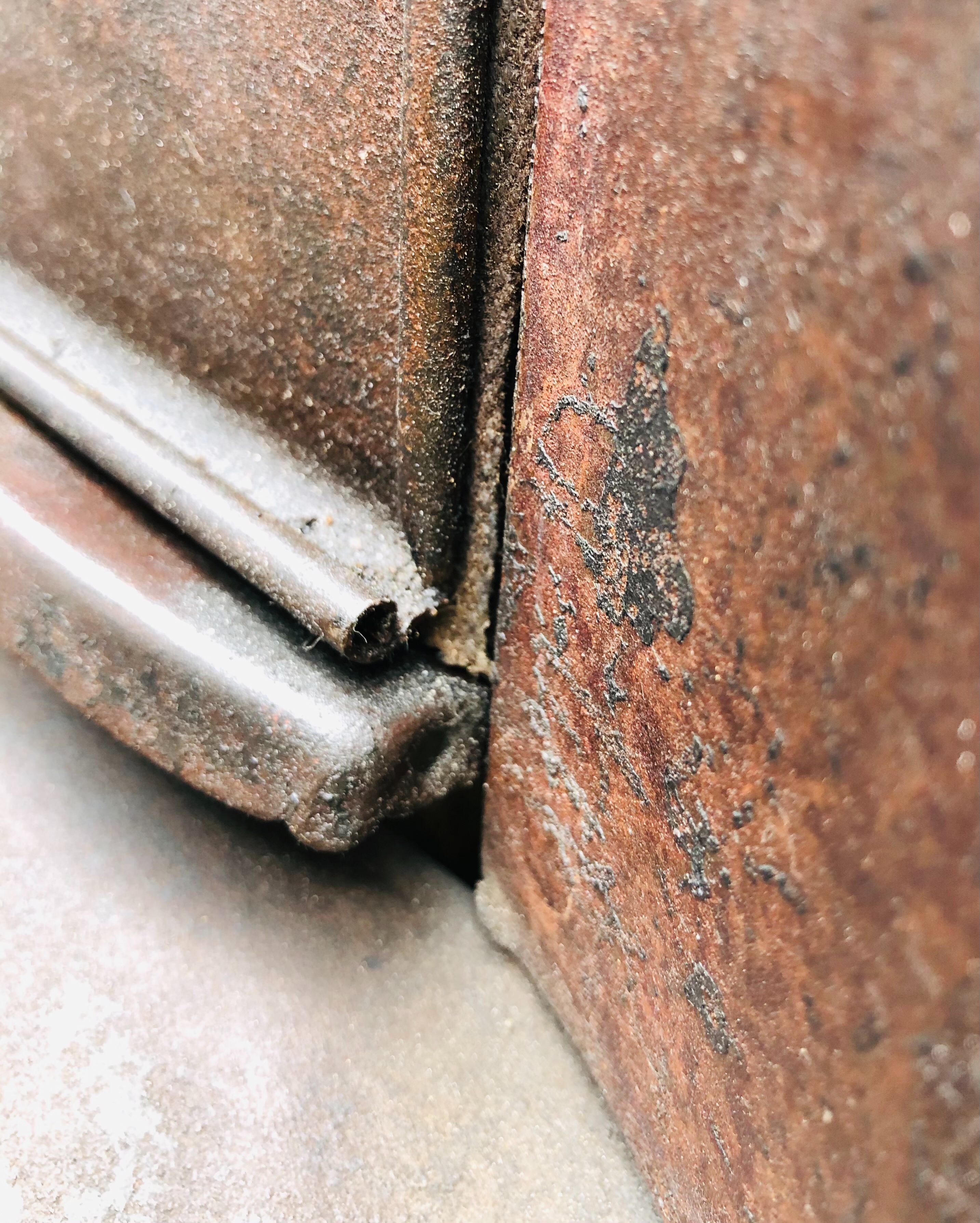 This hood shelf shows where the paint accumulated during the dipping process. There is very little paint anywhere else but it drained here to the point of wrinkling. This has no hole but I'm not sure that would have made a difference. It does give a clue as to what direction it was hung to dry.