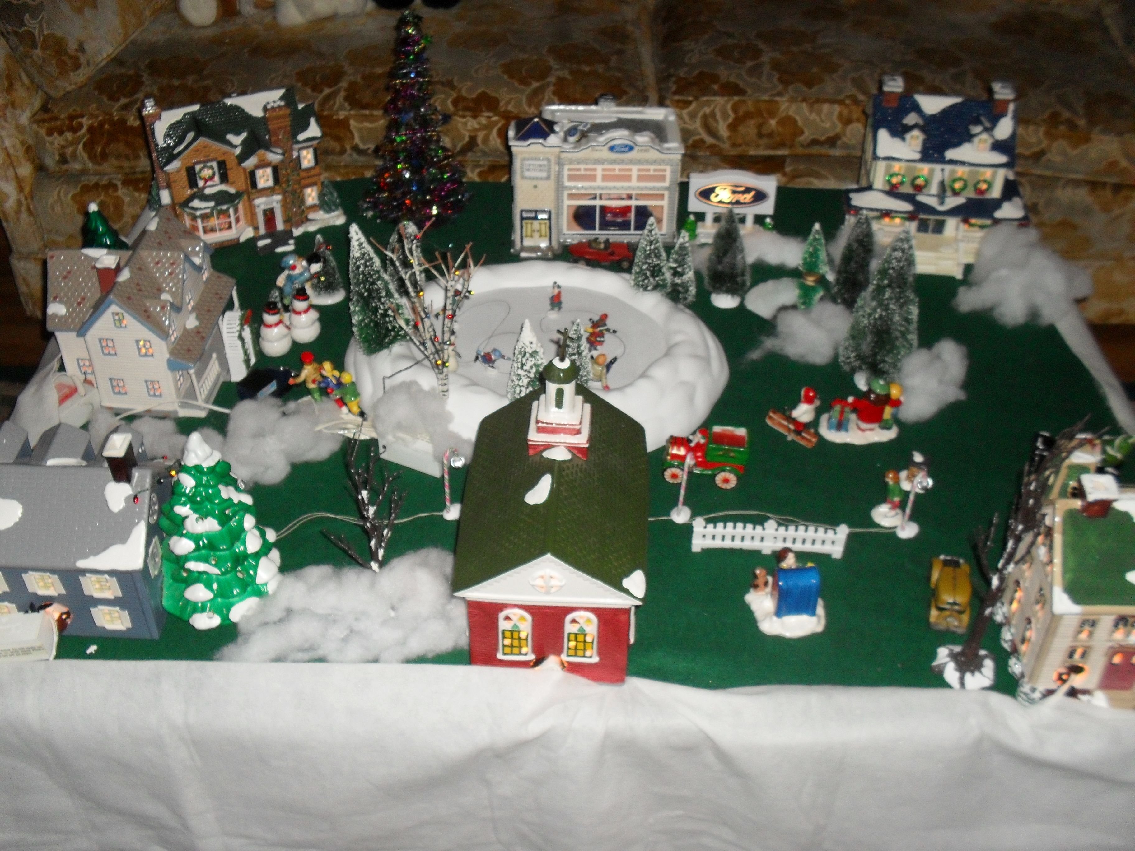 Here is our Christmas village with a Ford garage and a skating rink. If you look close, there is a speedster parked at the Ford garage.