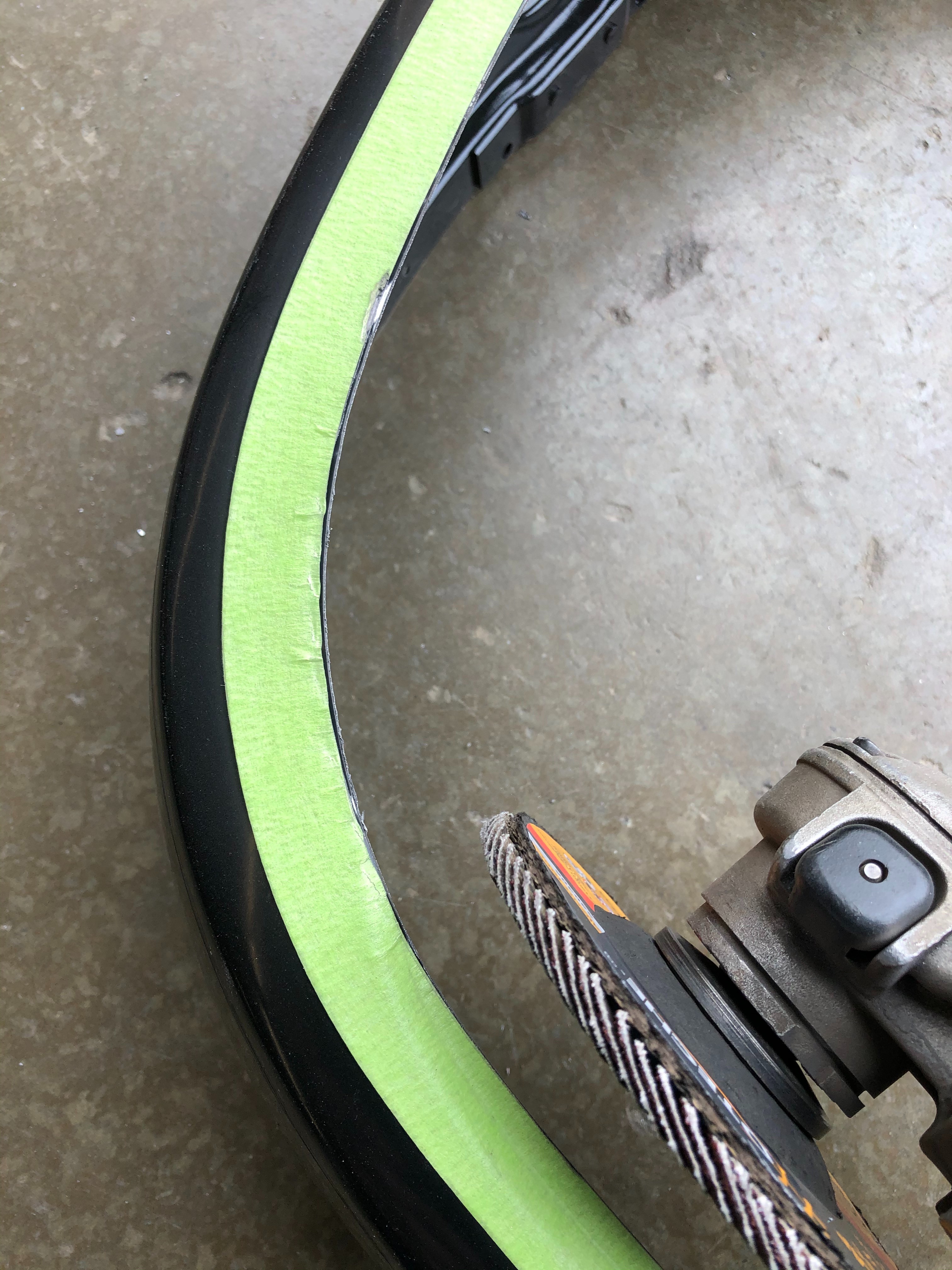 Sanding with a paddle wheel to the tape line.