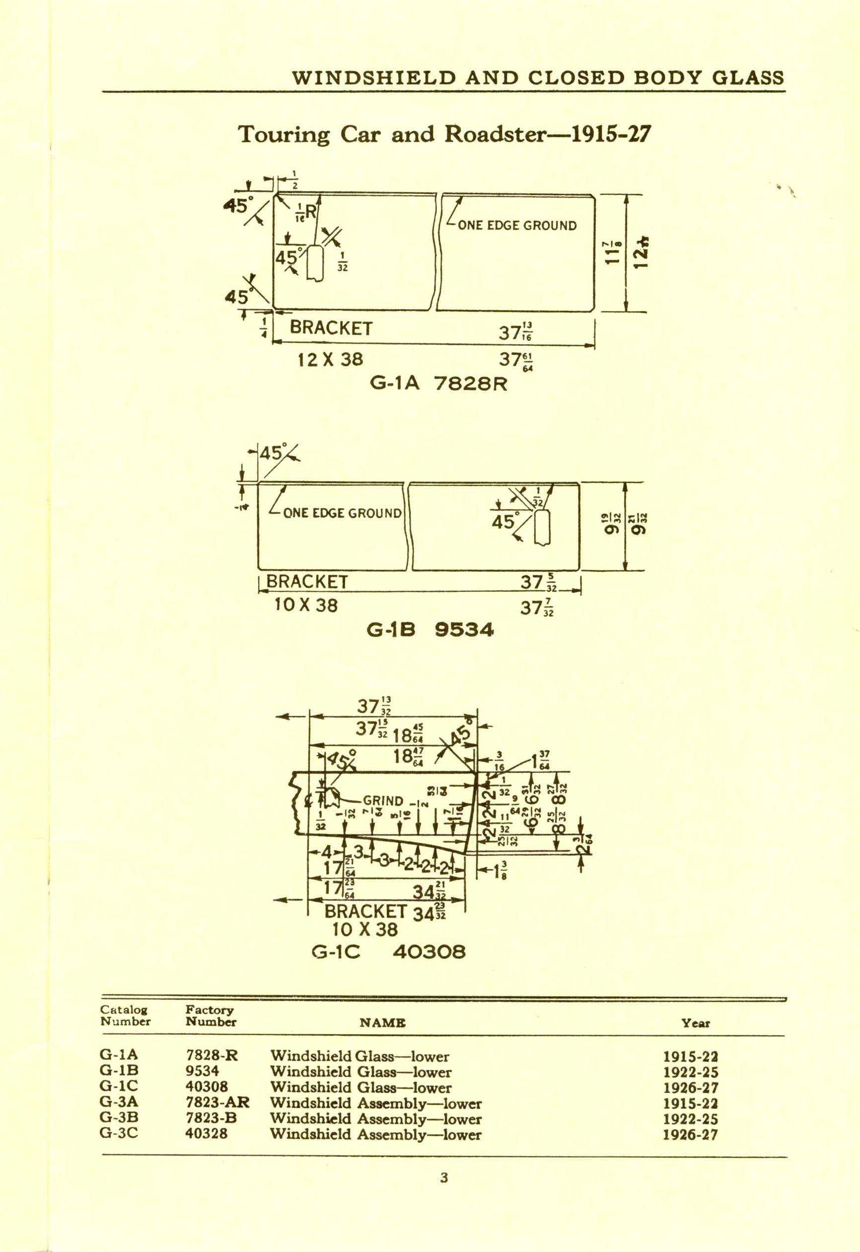 Here are scans from the Ford Windshield and Closed Body Glass booklet covering tourings and roadsters from 1915 through 1927.