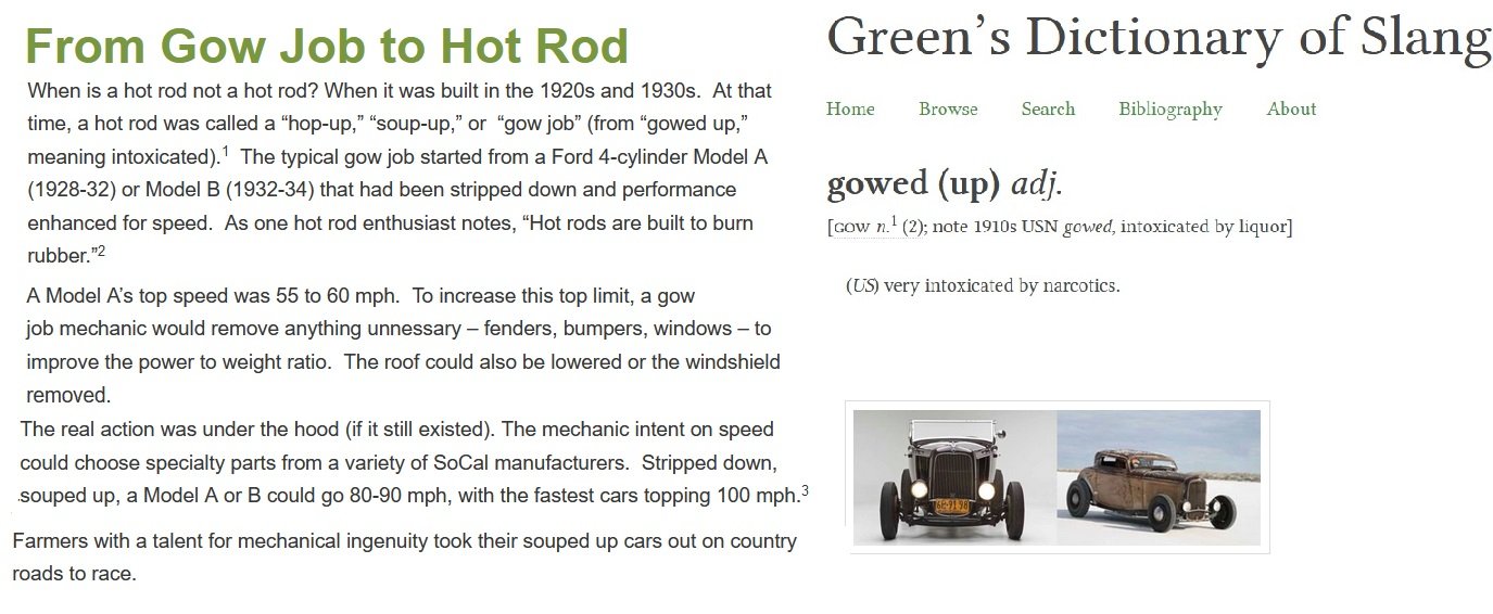 Don’t ever recall ‘gow job’ til 1990’s speak along with rat rods! Most times hot rod, racer and speedster. Old days jalopy and for open wheel T’s were called ‘bug ‘s’ , long before the Beetle of course!