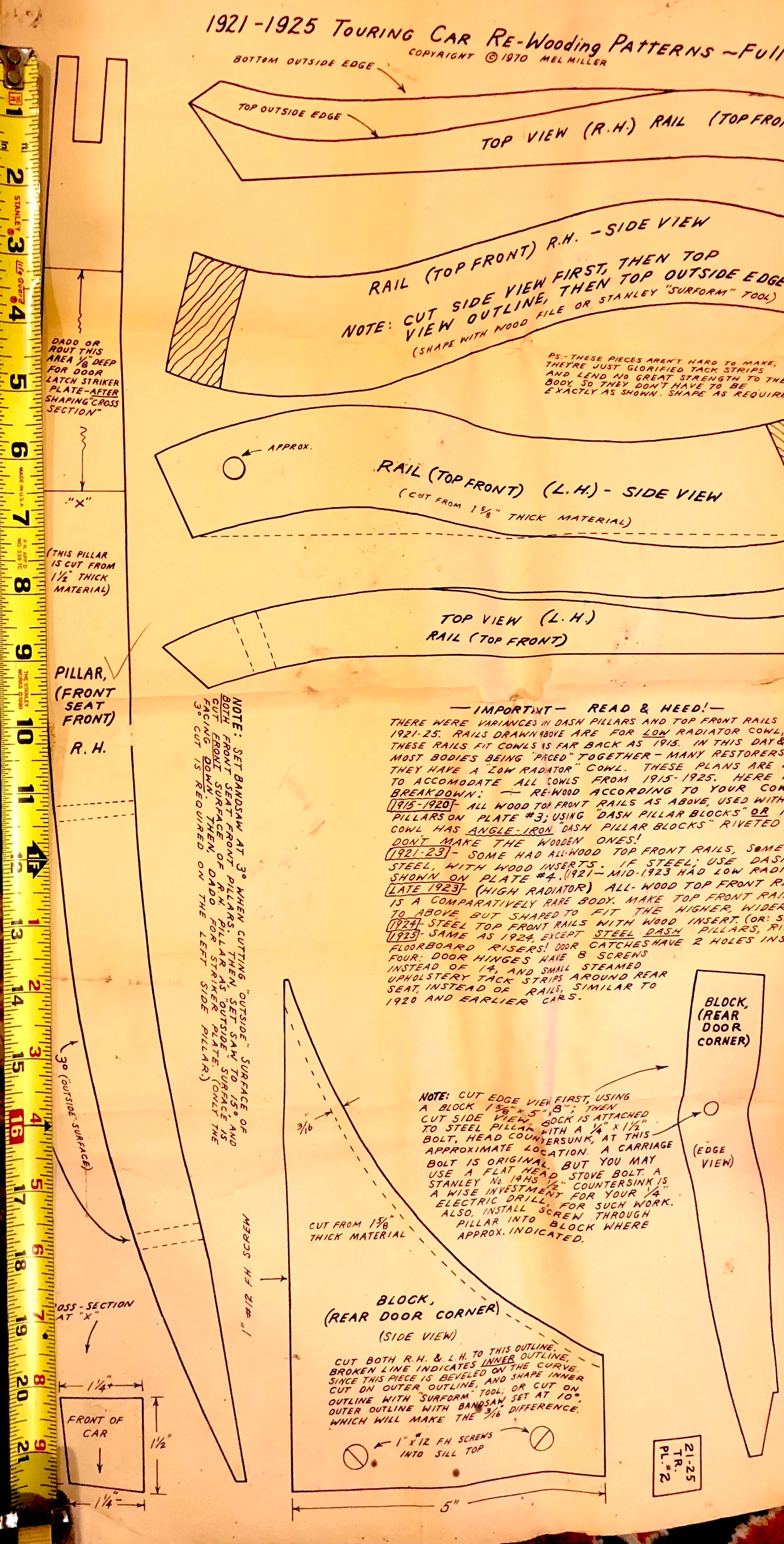 Ok so I have the Miller re-wooding plans for 1915-22 touring. My concerns are the front and rear pillars on ether side of the front seat. The 1923 body parts book shows 1915-1921 and the 1927 body parts book shows 1922 to 1925. Does anyone know what the differences might be? Height or curves? The wood in the body now, while somewhat "there" might not be good for patterns. At this point any wood I put in will be 1000 times better then what's there now, so if it is off a little I can live with that. Closer would be better. If it's a height thing, I can adjust for that. I know there will be fitting involved, so wondering about basic shape between the years.
