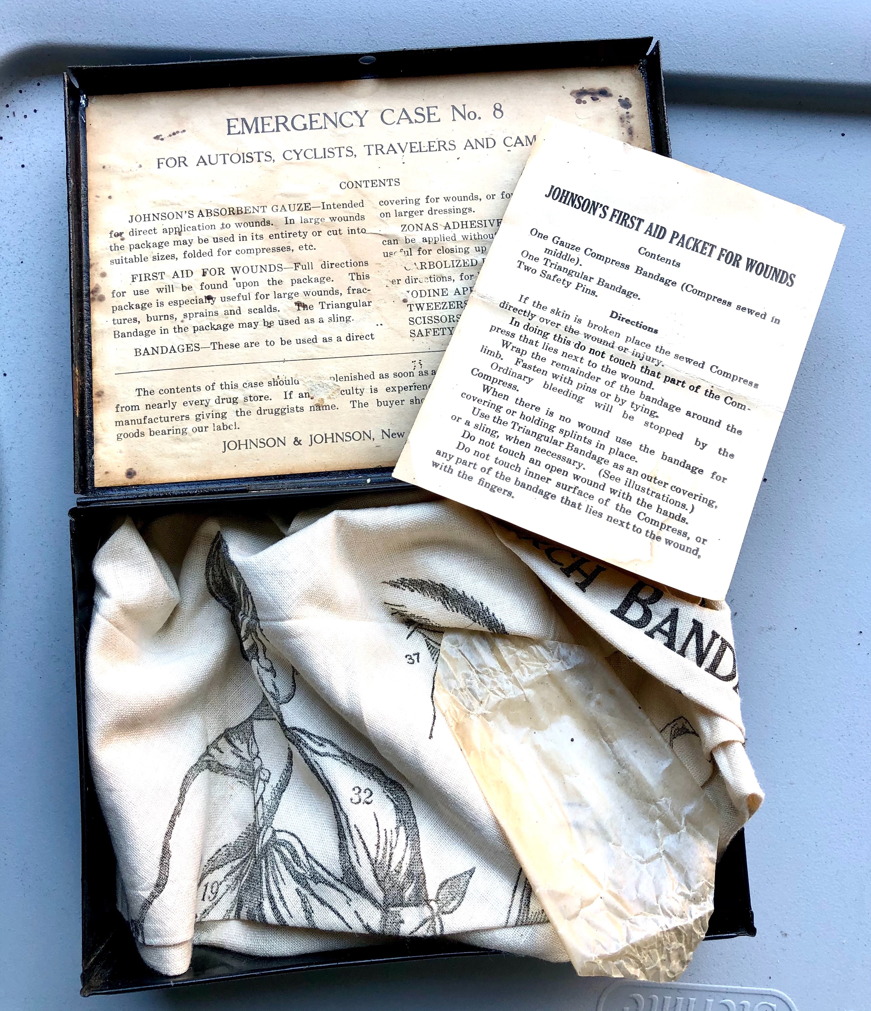 Plus this old J&J kit, missing most of the doodads, but still had the large cotton bandage, with silkscreen to show how to fold and bandage any part of the body!