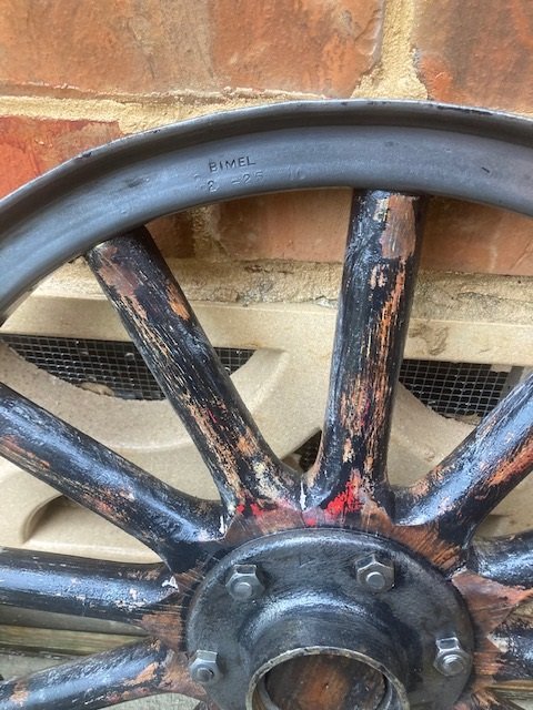 Ignacio, The print ad for the Bimel car says that the tire size is 32 x 4 , ( 32-8=24 fello, 30-6=24 Ford front wood nondemountable fello ), so your fello is same diameter as Ford nondemountable but is for a different wheel tire combo. Is the hub a production Ford front hub? The redrilled fello has a round hole that would require a certain type lug bolt with a flat side against the fello like some Chevy wheels used. You are going to have to check over the fit of the rim you plan to use on this wheel and compair it to your other wheels. For your safety the rim must fit on the fello correctly and the demountable lugs must fit the fello correctly. You also want to make sure that your spair tire wheel will work on all 4 wheels. The Bimel 2 25 probably means that the wheel was made in Feb 1925 but it could mean the 25 th of Feb of unknown year or mean ?? If you don't know tire and wheel size back in the day measured out side diameter at tread by the tire side wall measurement so 30 - ( 3+3 )= 24 Ford nondemountable wood fello front wheel in inches.