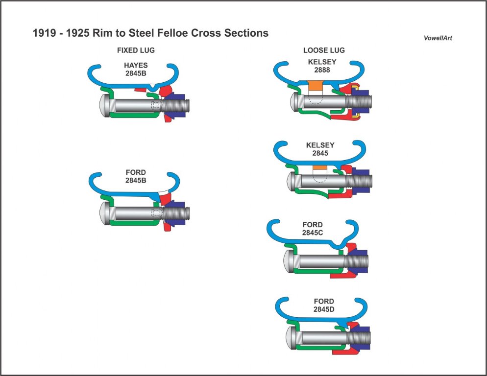 With regard to the Vowell art drawings, the top left one is representative of what I believe is a Hayes set-up. Top right is like Kelsey, but our Canadian sourced cars did not come with that style of lug/nut. Ours are typical of the right second down having the U shaped lug. You will note that on both these, the felloe has a dumped down ledge on which the longer, inner leg of the lug rests. This ledge is absent in the rest of the drawings, but the U shaped lug is still pictured. I believe this is not correct. Those lugs will cant as the rim bolts are tensioned, as there is no land for the inner leg of the lug to engage on the felloe.