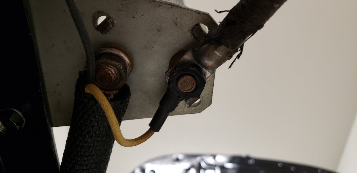 Sorry guys, the yellow wire that comes from the starter loom sleeve is connected to the upper or inner connection point which goes directly to the battery. The black wire is the tail lamp wire that is part of the loom. Left hand connection (closest to the frame rail) is the starter loom with sleeve; right hand connection goes to positive battery terminal.