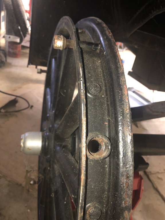 Since (with the help of this thread) we decided the felloe was scrap, we decided to take the wheel apart to get experience with removing spokes. After getting the spokes out we came across a surprise. The felloe went back to home (flat - straight). What we guessed was that the two front wheels were bent from an "accident", possible hitting a curb or something (since the drag link was bent as well). During impact the spokes moved a bit in the hub, keeping the felloe in the "bent" position. When we released the hub and spokes, the felloe retracted to home position. To prove this theory, we are going to loosen the hub bolts on the other front wheel and apply some pressure in correct direction if needed. We are thinking we can "straighten" the felloe while keeping the wheel together. Just a theory, will report later.