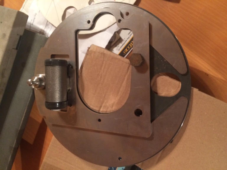 Les - Those plates look interesting. An original backing plate at the rear of them? Did you work out using an original cam setup for the emergency brake? Would like to know what you did to the shoes to keep them aligned on the front edge (right side in photo). Does that area handle e-brake duties too. This sure tempts me to want to see a picture or two of the completed setup ready to go but without the drum. I know you have other things to fill your life but you have me real curious.