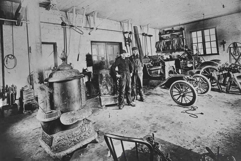 We can almost wall into these old garage photos. There is so much to puzzle over. I want the second car to be a Buick.