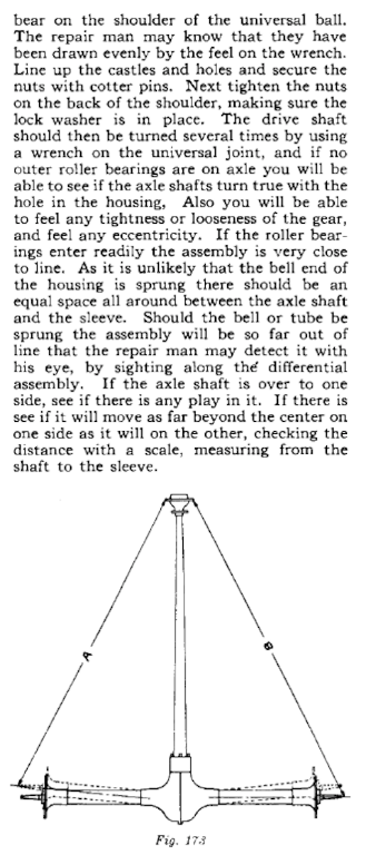 Bill Robinson posted recently that on his 1921, the axle was not centered in the torque tube. He later discovered by adjusting the radius rod, he could alter the position of the axle center, where as it had been previously not centered. This caused wear on the Hyatt cages and actual cut grooves in the axle shafts. This was after several years of service.