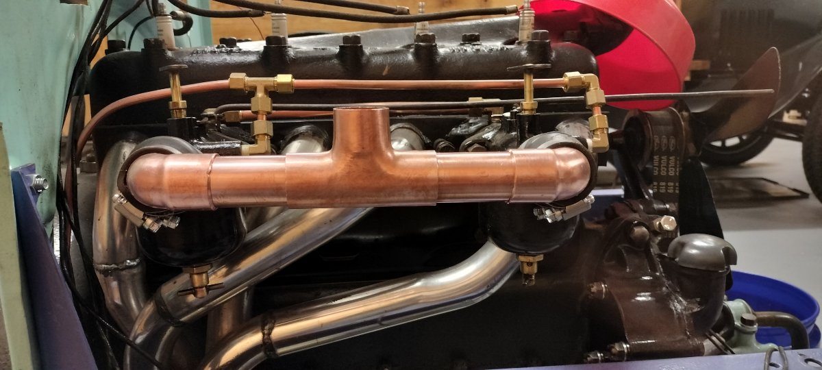 had a chance to put the new carbs on. world of difference and it runs with the crossover tube on it now. much more tunable. I have to get my radiator fixed so i can run it long enough to tune it. that's another issue. its a honeycomb rad from the 1910's and no one around here seems to know how to fix it. has one small leak on the side. anyway, different issue. here is a pic of the set up now minus the tube. i have to make a proper one. this, i think is doable.