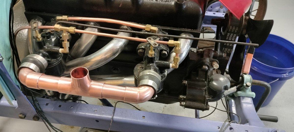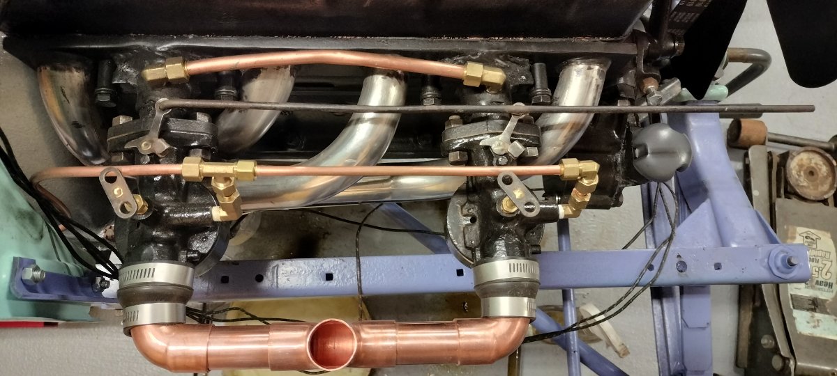 had a chance to put the new carbs on. world of difference and it runs with the crossover tube on it now. much more tunable. I have to get my radiator fixed so i can run it long enough to tune it. that's another issue. its a honeycomb rad from the 1910's and no one around here seems to know how to fix it. has one small leak on the side. anyway, different issue. here is a pic of the set up now minus the tube. i have to make a proper one. this, i think is doable.