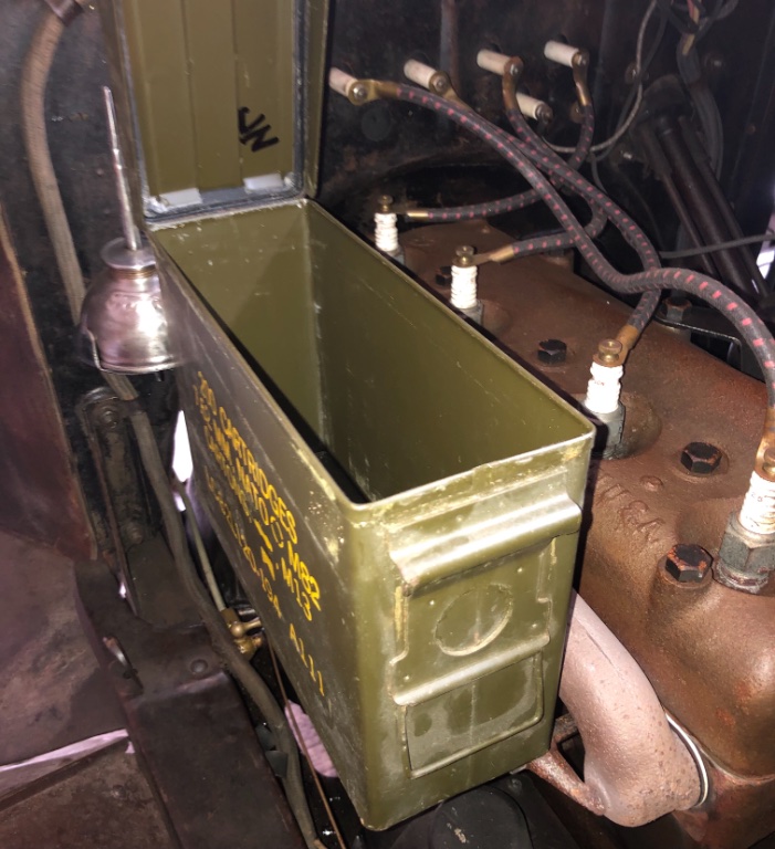 Add some metal L shaped straps to hang behind the manifold , with bolts or pop rivets to the backside of the can. You could even dimple the lower end of the ammo can at each manifold stud nut so the ammo can is right against the hot manifold .