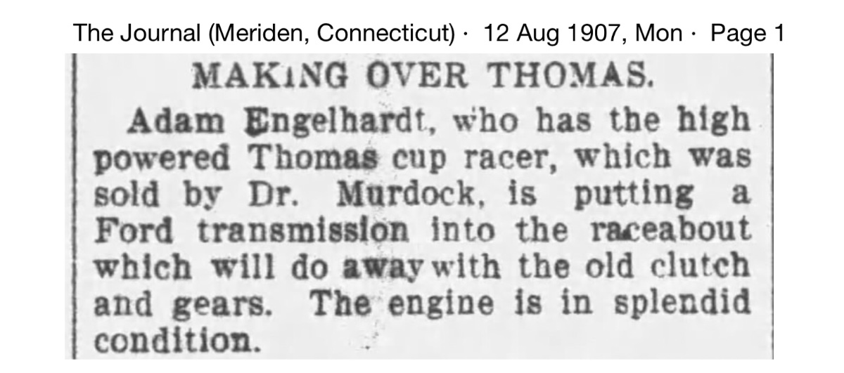 During the summer of 1906 we learn there are now six Thomas Flyers in Meriden, including Dr. Murdock's, and another person who will factor into this story, Adam Engelhart: