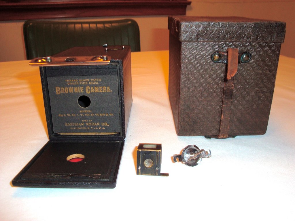 That was the original Kodak camera of 1888, it came preloaded with a 100 exposure film roll. You sent the whole camera back to Eastman for processing. http://camera-wiki.org/wiki/Kodak_Camera The cool thing about those was that the photographs are round. The Brownie came out in 1900, and the no. 2 Brownies were made from 1901 until I think about 1932. Box cameras in bewildering variations were made until at least the late 1950s.