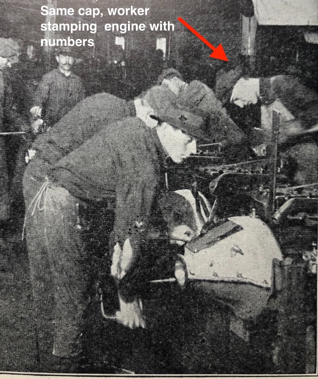 Here is the dedicated stamping worker in 1915, one view shows his box containing metal numeral stamps, and the other shows the same worker stamping the numbers on the block. Likely chosen for ability to hit the hammer blow correctly for a deep stamp that is placed best he can.