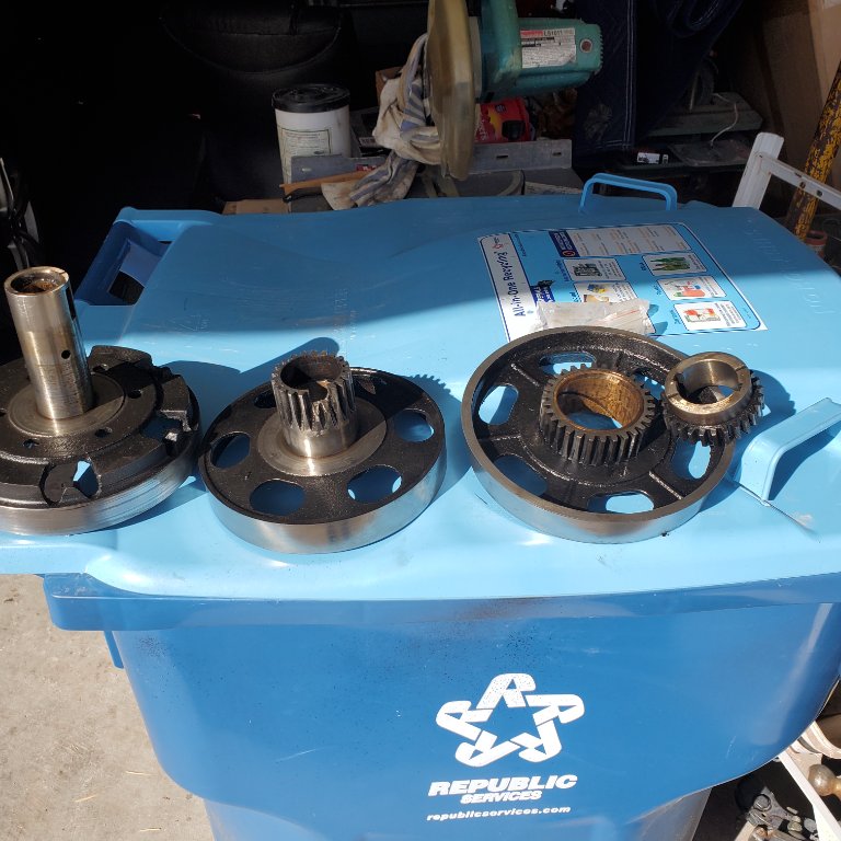 This is Carson's transmission drums. The gear on the low drum is galded and broken and the bushing is scored and loose. I'm thinking not enough clearance when installed. [/size][/image]