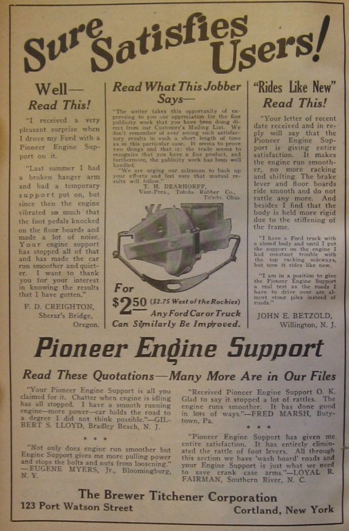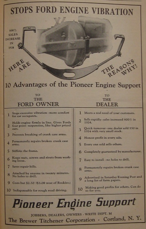 George, there were a lot of gadgets on the market in those days to improve your T. I bought this as a cutesy for my car many years ago and the gentleman told my it is merely a backup support. I bought it because I liked the looks only, but it could possibly save me if the pan arms actually break. The advertisement above states it will stop the rattling and so forth and make the car smooth and pleasant to drive. It is merely affixed to the frame in the same place as the pan ears and the frame and if the car was running rough it will still run rough after this pan support is installed. Putting a inner tube piece between the support and the pan might keep it from chafing the pan but it won’t make the motor run smoother. It is a nice looking, just in case the pan arms break, idea only in my opinion. The inner tube idea is good but I was told to install it firm but not crush the pan up. I am getting my motor rebuilt at the moment but will be reinstalling the pan support again, just in case I break a pan arm and the conversation value of the thing.