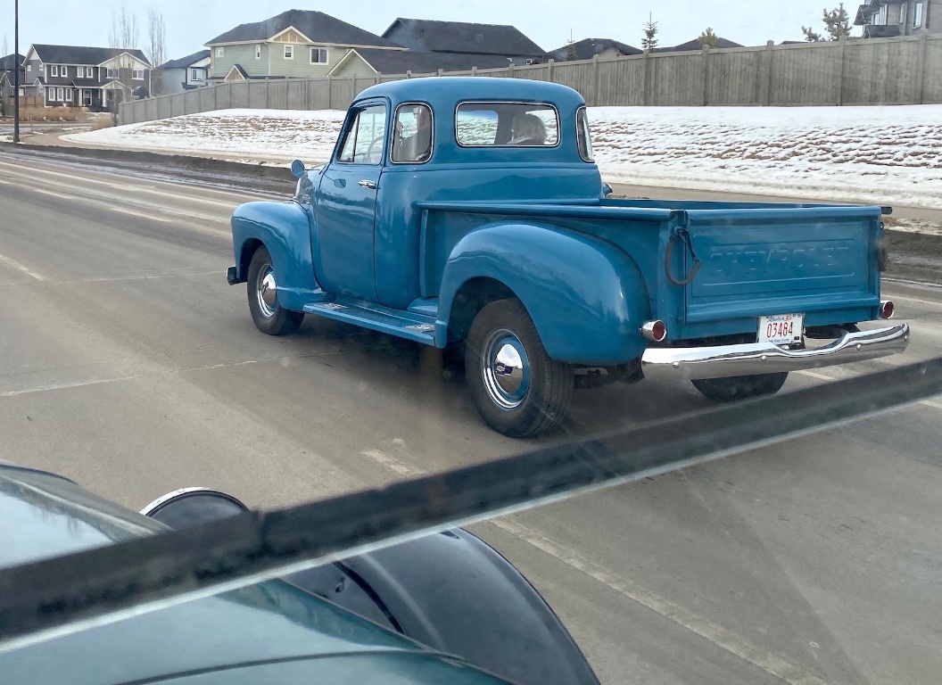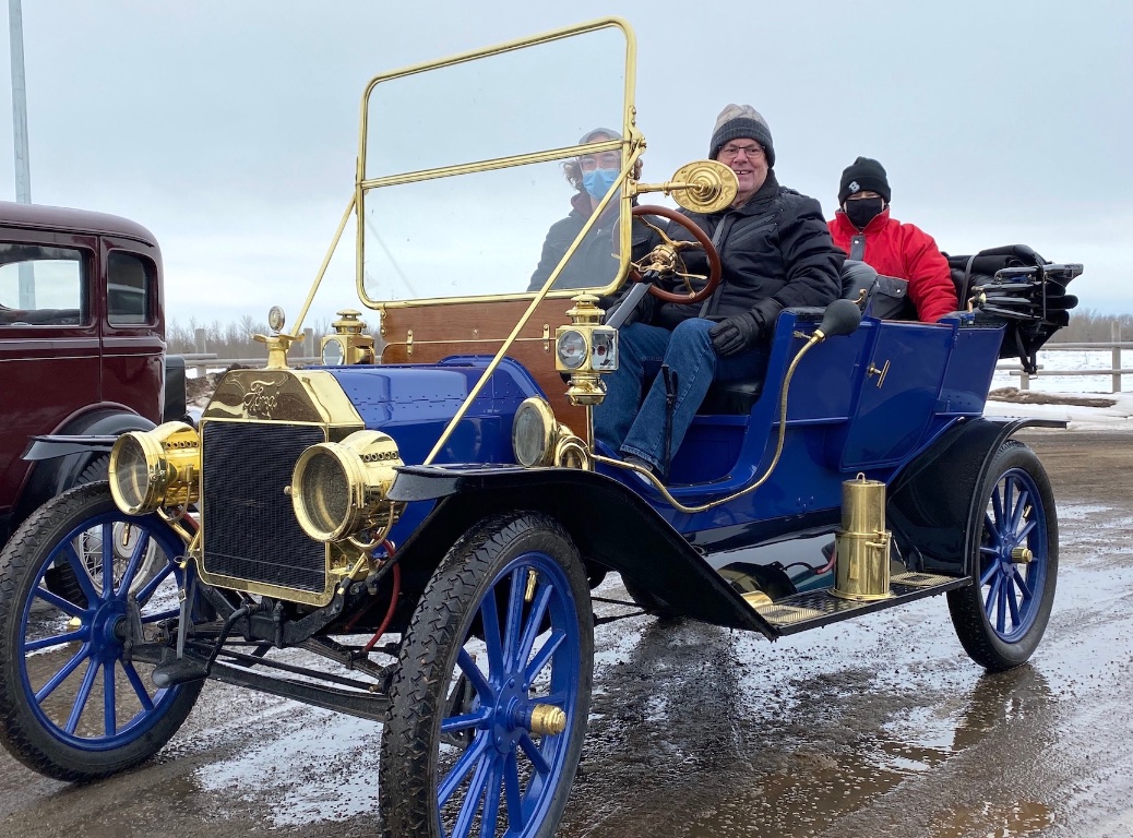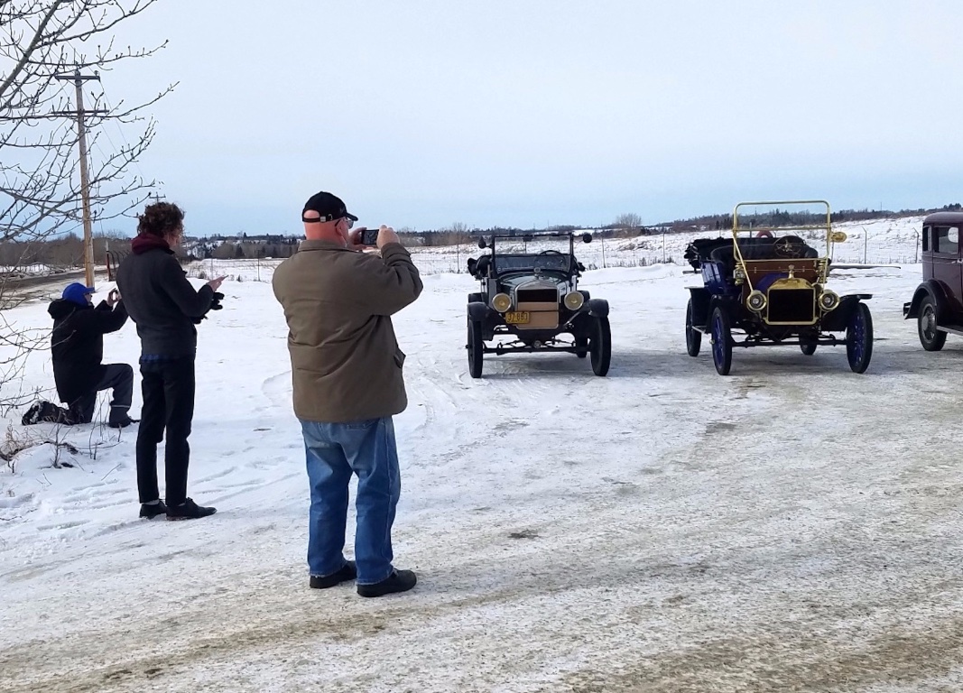 Several local club members have been out driving the oldies a few times this winter. Yesterday four vehicles carrying eight souls went for a 30-mile country drive northeast of Edmonton, AB. The weather was unseasonably mild at 8°C (46°F) and very pleasant for open-air motoring. Roster was my '26 Touring, Mike's '11 Touring, Bob's '30 Hudson and Ron's newfangled '53 Chev. Danin, Jerry, Ryan and Don rode shotgun.