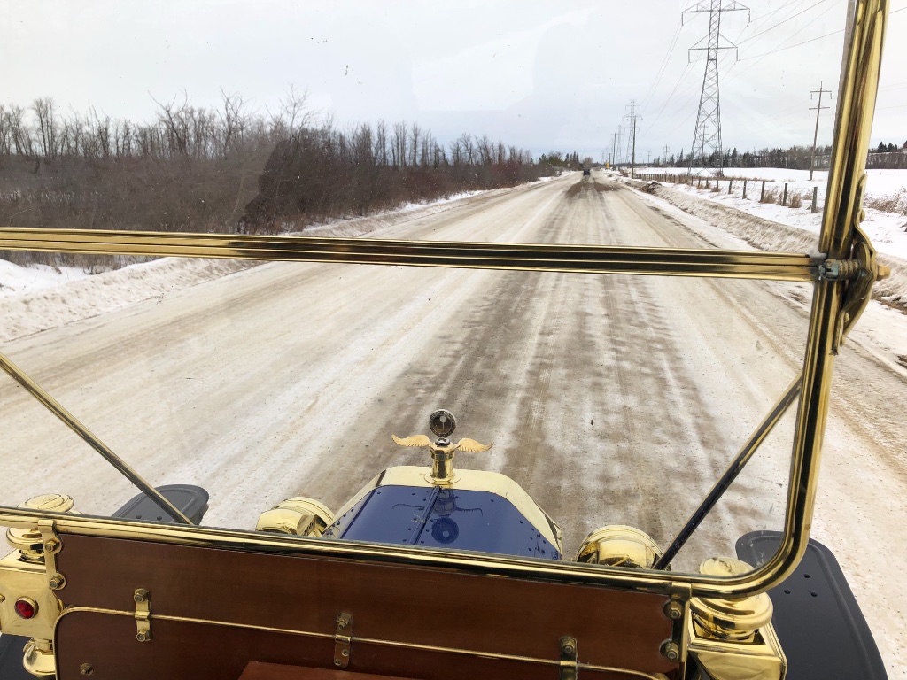 Several local club members have been out driving the oldies a few times this winter. Yesterday four vehicles carrying eight souls went for a 30-mile country drive northeast of Edmonton, AB. The weather was unseasonably mild at 8°C (46°F) and very pleasant for open-air motoring. Roster was my '26 Touring, Mike's '11 Touring, Bob's '30 Hudson and Ron's newfangled '53 Chev. Danin, Jerry, Ryan and Don rode shotgun.
