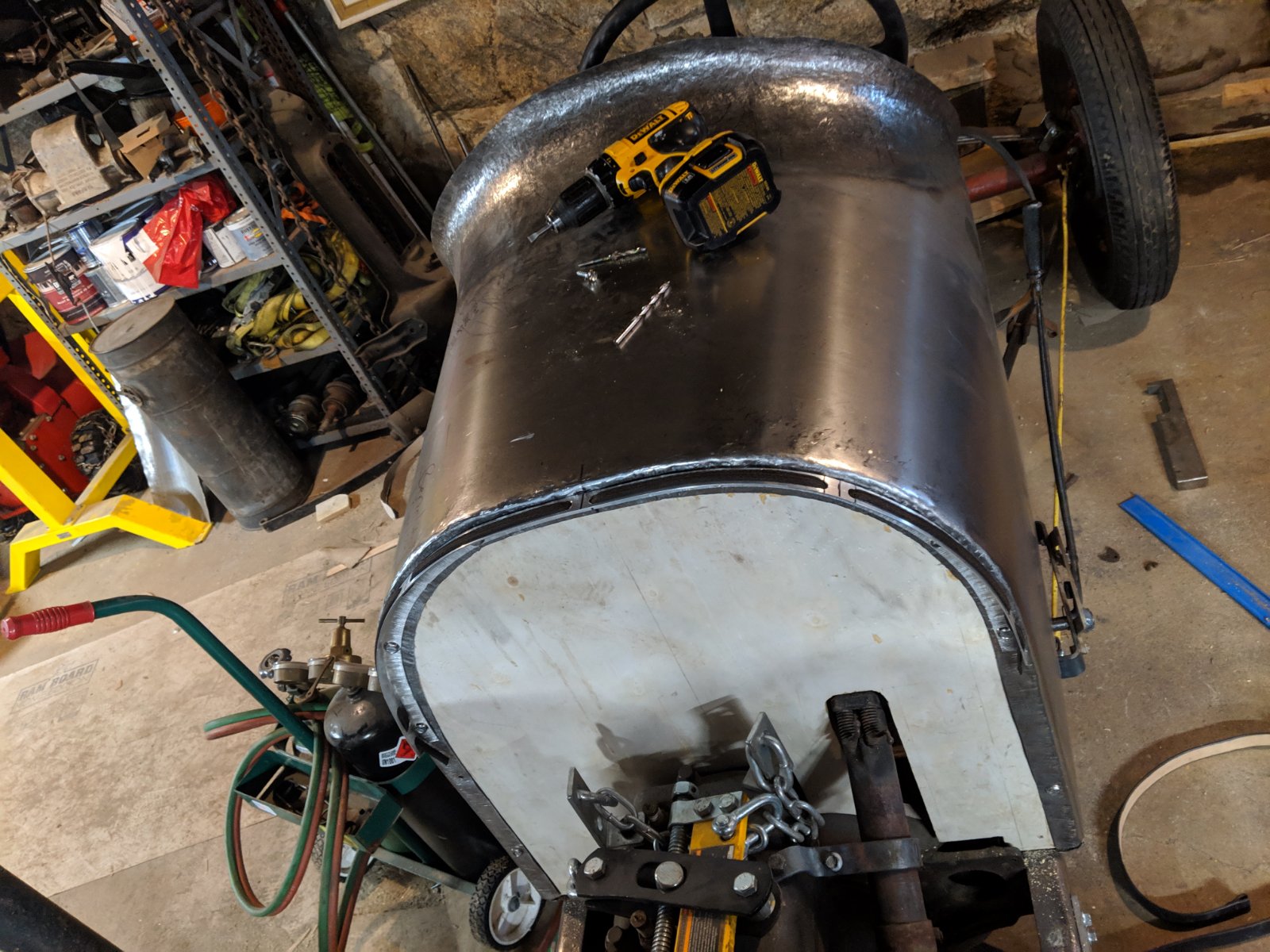 I then began working on the fuel system. The gentleman who builds the reproduction T tanks made me a custom one which is 3" narrower and sits behind the seat nicely. I then got a fuel fill adapter which threads into the tank, a fuel coupling, some t radiator hose clamps, a brass pipe, and a cool old brass flip top filler and created the filler neck. I used a harbor freight hydraulic knock out punch to put a perfectly round hole in the body. I also soldered the filler cap on because the tank will be pressurized.