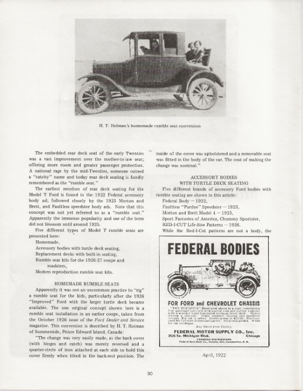 I have a 26 Roadster with a rumble seat. The rumble seat is not original equipment on the model T. The first Fords to have a rumble seat were Model A's. Someone who had this car before reversed the trunk lid and made it into a rumble seat. The upper part of the top was cut so that it could be opened or closed with the top down. I also cut my finger one time on a tour when it slammed down as I was reaching for a tool and spent a few hours in an ER getting it stitched back on. So now whenever I open it, I use a bungee cord to the spare tire.