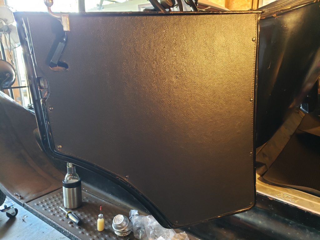 Some cutting needed at the slot for the handle, a paper pattern helps, or use chalk impression of the handle swing. Metal bezels are fitted to the cut slot to prevent handle wear and at the latch too (unless the repro door cardboard is vinyl covered and has stitched hem).