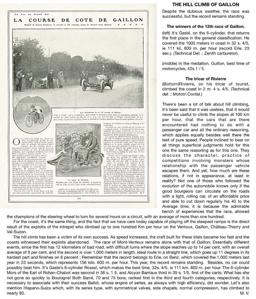 The article tells us that unlike Mont Ventoux, which the Ford Special took second place over all on a winding 13 mile course, Gaillon is a 1,000 meter straight line uphill race. The overall winner, Gaste in a six cylinder Roussel, was 3rd at Mt. Ventoux, behind the 2nd place Ford.