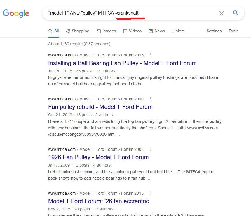 As Lydon suggested: Adding MTFCA before or even after you search words works on Google, Yahoo and Bing to give priority to matching search criteria there. But it isn't searching the Forum in particular its just another search word that is less common that the words MODEL and T