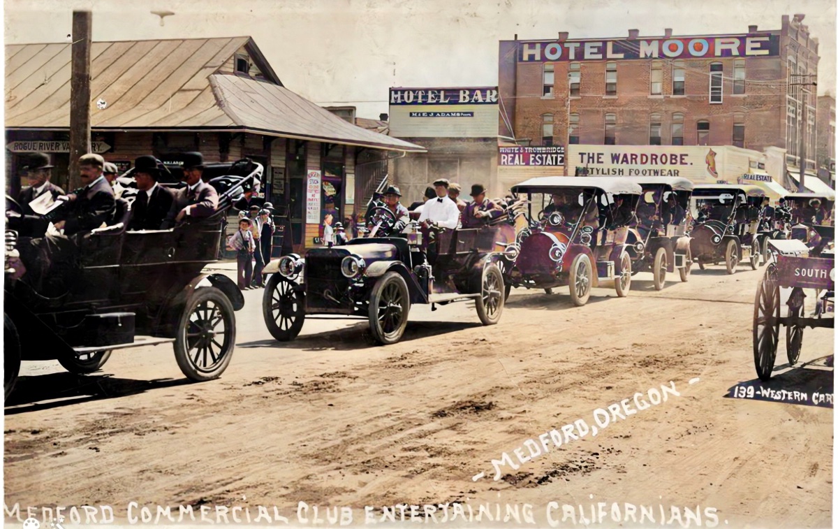 This is what we learned. The photo was taken in June, 1909. There were over 50 Medford area cars in this procession, and they met a group of 100 Californians returning from the Exposition in Seattle (Ocean to Ocean race destination) via special train. The Medford Commercial Club coordinated for the train to drop the Californians at Medford, and then be taken by car for a tour of area Orchards, meeting the train again in Ashland to continue back to San Francisco. One other unique feature of this trip, the train was equipped with wireless telegraph, and had been in touch "at all times" with a wireless station in San Francisco: