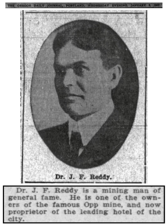 In 1903 the election of a new Mayor in Spokane, Dr. Reddy is no longer Chief of Police. By 1904, his interests in mining and hotel ownership have taken him to Medford OR, known for it's fruit orchards and growing mining prospects: