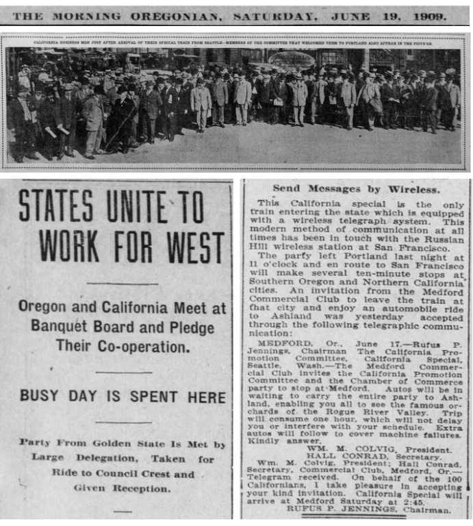 This is what we learned. The photo was taken in June, 1909. There were over 50 Medford area cars in this procession, and they met a group of 100 Californians returning from the Exposition in Seattle (Ocean to Ocean race destination) via special train. The Medford Commercial Club coordinated for the train to drop the Californians at Medford, and then be taken by car for a tour of area Orchards, meeting the train again in Ashland to continue back to San Francisco. One other unique feature of this trip, the train was equipped with wireless telegraph, and had been in touch "at all times" with a wireless station in San Francisco: