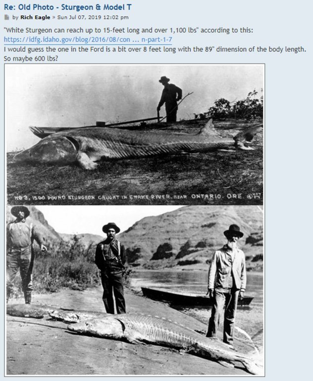 A big ol' sturgeon caught in the Snake River in the Burley area, no date given. Too bad we can't see all of this 1914 touring. The hood louvres indicate an accessory front end. Photo taken in front of a Ford dealership.