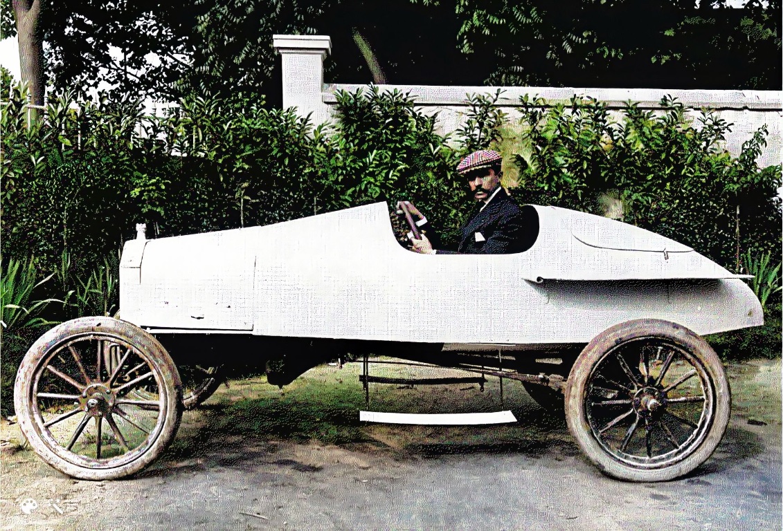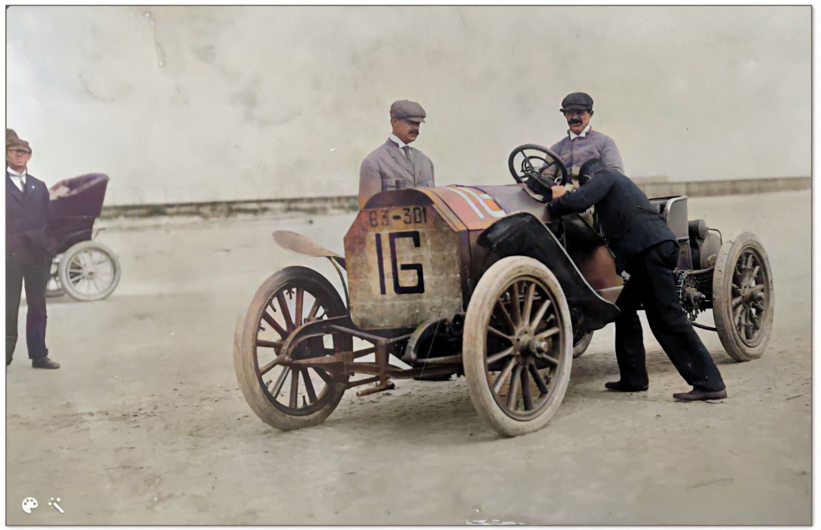 I didn't realize until I saw these photos colorized, but Gaston Plaintiff (left), Ford N.Y. Branch manager, is leaning in, talking with A. L. Campbell, driving his Darracq. I believe this was Henry Ford's last race for time. He beat Campbell and the Darracq, setting a new One Mile for Competition record. However, the Darracq team filed a complaint, arguing that Ford crossed the start line (most races were from a "flying start," with racers expected to cross the start line at the same time, while building speed). The record was disallowed, and Ford didn't set a world record that day.