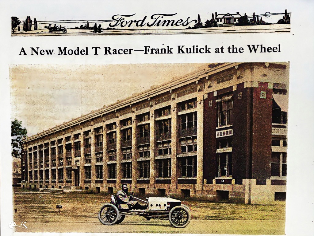 Ford Times photo of Frank Kulick seated in the largest Ford Special racer after defeating the Blitzen Benz in a one mile match race in the fall of 1911 at the Michigan State Fairgrounds: