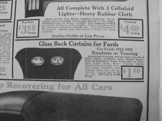 Below is an original, NOS side curtain from a set for a touring with its original celluloid windows.