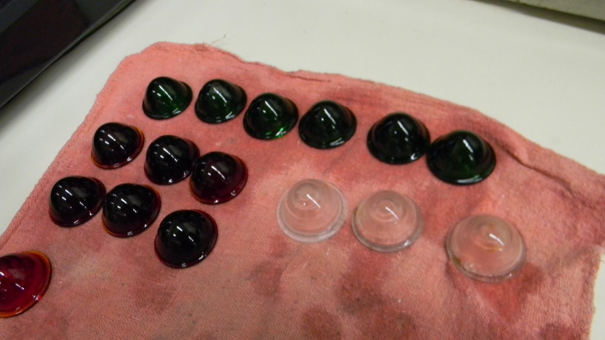But those to me look like common commercial clearance lights as used on commercial vehicles, vans, box trailers, flatbed trucks and trailers beginning in the very late 1930s and all through the 1940s-1950s and 1960s. Harsh working conditions broke a lot of those domed lenses so replacements were sold by the thousands! Most common colors were amber and red. Blue and green were also used for special applications. They were made by several companies, and sold in almost all automotive supply stores for decades. Flatbed and box trucks were required in many states to have a lamp every so-many feet. Hence, 'clearance' lights so that a truck could be outlined and seen in the dark.