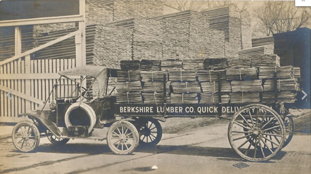 The Berkshire Lumber Co 5th wheel is bothering me a bit. Just trying to figure out what car that is under the front of the 5th wheel trailer? The front fender has the anti-vibration rib across the middle of the fender, added for 1913. The fender also appears to have the front 'bill', a 1912 feature. And the windshield appears to be 1912 or earlier. The body appears to be a cut-off, but a cut-off what? The lower behind the seat area looks like a runabout of 1913 or later? However, no runabouts or roadsters 1912 or earlier had that transition shape to where the later turtle deck was fit into place. Tool box and spare tires obscure much of the rest of the body.
