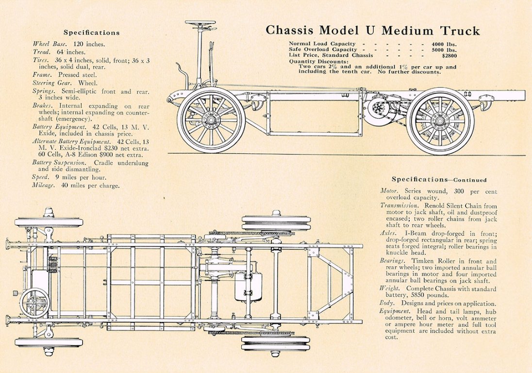Here is a layout of the "Medium" Baker Electric Model U Truck chassis. They made a Model X Delivery, a Model O Light Truck and a Model CC Heavy Truck also. This is from a 1913 catalog. This illustration shows the drive.