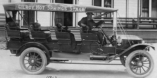 In 1913, the stables modernized, adding a powerful motor stage to their line, a new 1913 Stanley Model 810 12-passenger 30 hp Mountain Wagon. The mountain wagons were designed for use at F.O. Stanley's resort hotel at Estes Park, Colorado. There was no train service to the park and the 22 mile trip was miserable in a horse-drawn stage. The Mountain Wagons proved so well suited for the work, hotel owners across the country wanted one (or two or three). And so Serpa & Pimentel bought one to serve the Hot Springs. When the huge, new red car arrived, they photographed it in front of the Hot Springs Hotel on its maiden voyage.