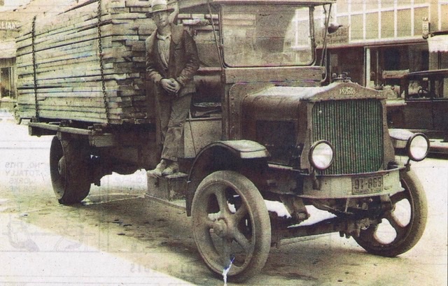 The Berkshire Lumber Co 5th wheel is bothering me a bit. Just trying to figure out what car that is under the front of the 5th wheel trailer? The front fender has the anti-vibration rib across the middle of the fender, added for 1913. The fender also appears to have the front 'bill', a 1912 feature. And the windshield appears to be 1912 or earlier. The body appears to be a cut-off, but a cut-off what? The lower behind the seat area looks like a runabout of 1913 or later? However, no runabouts or roadsters 1912 or earlier had that transition shape to where the later turtle deck was fit into place. Tool box and spare tires obscure much of the rest of the body.