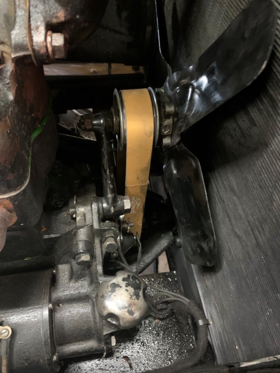 I was able to get the correct belt to fit!! I replaced those worthless repro hose clamps with modern worm gear clamps. Now it does not leak. All though the leak was coming from the upper hose. The repro radiator neck is not the right size and it is too short. Not sure what manufacture it is? It is not like the Brassworks radiator that I put in my 26 Coupe, it fit fine. It does however hold almost 3 gallons of coolant. Now, I need to fix the pulley, as It is leaking out the 600W oil that I put in it and making a mess under the hood!
